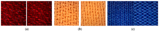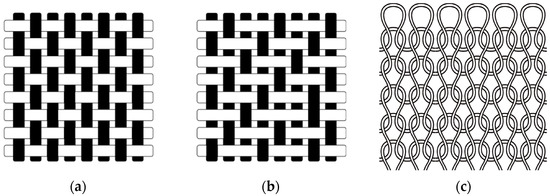 Images of three specimens with different fabric constructions taken by an image analyzer. (a) Plain-woven fabric; (b) twill-woven fabric; and (c) plain knit.