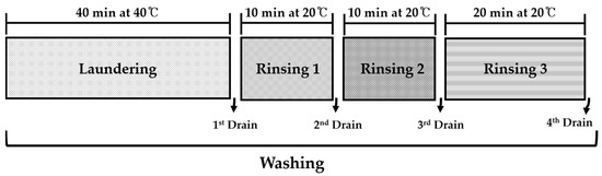 Fabrics were washed in a front-loading washing machine (F9WK, LG electronics, Seoul, Korea) with a 9 kg capacity through a standard course without a dummy load. A standard washing course proceeds with one laundering and three rinsing procedures (Figure 2). During laundering, fabric specimens were washed for 40 min at 40 ± 2 °C, and for 10 to 20 min at 20 ± 2 °C during each rinsing procedure. Fabrics were washed with tap water (pH = 7) without adding detergent. Wastewater from each washing cycle was collected separately to determine the amount of microplastics generated during each procedure. After completing the experiment, the empty washing machine was washed thrice to eliminate residual microplastics or other contaminants.