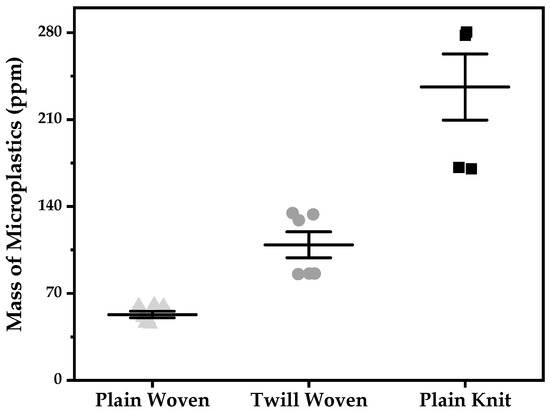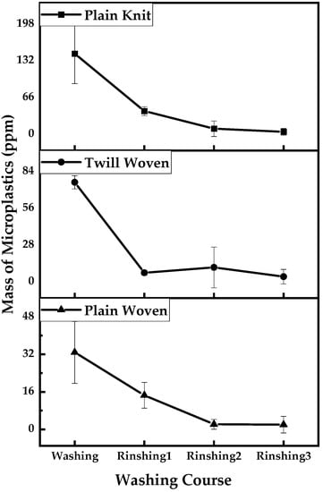The results comparing the microplastics released from three different fabrics during washing are shown in Figure 3. The amount of microplastics released from plain knit fabric was higher than that of the two types of woven fabrics, and more microplastics were released from the twill-woven fabric than those from the plain-woven fabric.