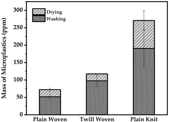 The amount of microplastics released during drying showed similar tendencies to washing (Figure 6). The amount of microplastics released from the plain-knit fabric was higher than the two types of woven fabric. As observed during washing, drying presented the same correlation between the degrees of freedom of the fibers and microplastics released, depending on the fabric construction.