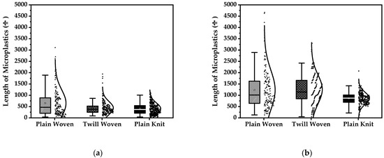 Considering fabric construction, the fiber length distribution of microplastics released during washing and drying is shown in Figure 7. Descriptive statistics of the lengths of the released microplastic fibers are presented in Table 2. The lengths varied from the shortest fiber length of 37 µm to the longest one of approximately 4667 µm.