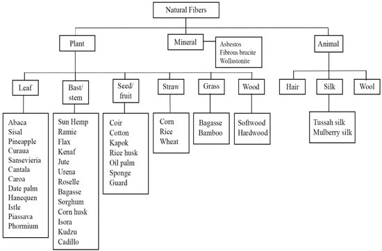 Scientists, researchers, and practitioners around the world have recently been working to maximize the potential of natural fibers to create the most sustainable, biodegradable, and high-quality natural fiber products [,,]. Natural fibers, which are renewable and ecologically acceptable sources of raw materials for producing environmentally friendly products, have played a significant part in human civilization []. Natural fibers have many advantages over synthetic fibers, including lower density, lighter weight, lower cost, biodegradability, minimal health hazards during processing, abundant availability and ease of availability, low investment at low cost for production, lower energy requirements, and lower CO2 emissions, indicating that they have great potential as a substitute for glass, carbon, or other synthetic fibers. Natural fibers are desirable bio-sourced materials as an alternative to non-sustainable glass and carbon fiber reinforced composites owing to their availability and technical viability.