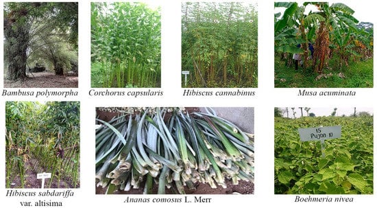 Ramie (Boehmeria nivea S. Gaud) is a kind of compatible fiber, making it is simple to be combined with a variety of other fibers []. Ramie is a fast-grown and branchless plant that can reach a height of 1 to 2 m. The stem-extracted bast fibers are the strongest and the longest natural bast fibers []. The productivity of ramie fiber is determined by the stem’s height, diameter, skin thickness, and fiber yield (fiber content per stem). Since the fiber production can be carried out every 2 months, harvesting is conducted 5 to 6 times per year in tropical areas like Indonesia. China grass crude fiber contains around 2–4% of fresh stalk, 1–3% of degummed fibers, and 1–2% of hemp top [,]. Furthermore, ramie production is about 100 thousand tons per year, which is higher than abaca fiber production, at about 70 thousand tons per year []. According to Soeroto [], these plants could grow in Indonesia’s middle to highland areas, with the highest productivity in the highlands (700 mdpl) from 2.5 to 3.0 tones/ha/year []. Ramie productivity per hectare is much higher than cotton [] and its fiber quality is higher than cotton with the color and luster comparable to natural silk. Furthermore, ramie absorbs 12% of water while cotton absorbs just 8% [].