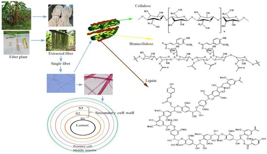 The principal constituents of lignocellulose, which included the cell walls, are cellulose, hemicellulose, and lignin. Aside from that, ash, silica, pectin, waxes, and water-soluble compounds [,,] and oil [,] can be found in natural fibers. Plant growth conditions, harvesting period, geographical considerations, and fiber extraction technology all affect the chemical component within the same plant species []. To assure the quality of the manufacturing process, the impact of various plant material properties must be analyzed []. The fiber characteristic is determined by the angle of the microfibrils and their placement within the cell wall []. Figure 3 depicts the position of chemical components in the cell wall (a) and layer position in the secondary cell wall of a plant. Cellulose uses lignin and pectin as glue to join with hemicellulose. The cellulose content of cell wall increases from primary layer (S1) to secondary layer (S2), while the lignin content decreases. Hemicellulose content is found in equal amounts in each layer. The S2 layer is primarily responsible for the physical and mechanical strength of fibers. It has lower microfibrillar angle, higher cellulose content, and contribute to improve fiber strength properties [,].