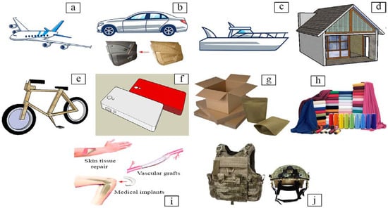 Natural fibers have been favored over synthetic fibers because of their superior qualities [,]. Natural fiber has been used as a raw material in a variety of industries, including aerospace, automotive, marine, building and construction, sports and leisure items, electronic appliances, military vehicles, biomedical purposes [,,,,,,,,] as shown in Figure 4: Natural fiber applications are also increasing in textiles, packaging, printed goods, filters, automobiles, furniture, particleboard, insulation board, and other materials [,,,]. Woven-kenaf aramid and pineapple leaves were used in military vehicles, especially for ballistic purposes [], and hard armor plate [,], respectively. In biomedical applications, natural fibers are in fiber-reinforced composites (FRC), such as various clinical fields [] as described in Table 2. Hemp and sisal have been reported for utilization as cementitious construction and fancy materials in the construction field [,]. In the biomedical field, the most promising natural fiber candidate is undoubtedly cellulose, in the form of nanofibers. Nanocellulose has a variety of biomedical applications, including drug delivery, vascular grafts, skin tissue regeneration, antimicrobial membranes, medical implants, biosensors and diagnostics, and scaffolds []. Several methods have been developed to improve the compatibility of natural fibers and polymer matrices in order to enhance the physical and mechanical properties of targeted bioproducts. However, the acceptability of natural fiber and biocomposite materials by the human body is a critical requirement that must be addressed [].