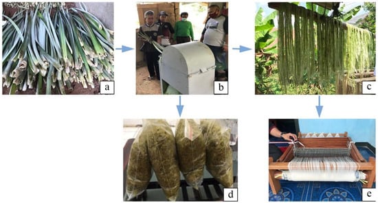 Additionally, the Indonesia Natural Fiber Council (DSI) was founded in Indonesia to assist scientists, policymakers, and other stakeholders in the development of bioproducts generated from natural fibers. DSI proposed a road map for the Indonesian fiber sector from 2020 to 2024, with abaca, kenaf, bamboo, pineapple, sisal, cotton, and ramie as types of promising fiber to be further developed []. Furthermore, biduri (Calotropis gigantea) is a natural fiber that has the potential to be developed in Indonesia as a thermal and acoustic insulation material and filler material [] and for winter jacket []. Biduri fiber production is predicted to be around 3.6 tons per hectare per year []. Some bioproducts, such as biopellets, food, textiles, biocomposites, and ecofriendly shoes, have been launched into the Indonesian market as a result of continued efforts. In addition, several small local businesses extract fiber from fresh pineapple leaves using basic techniques such as retting followed by decortication for clotes, handycraft, and other items. However, the process output is still low, with 2.5 kg of air-dry pineapple fiber produced from 100 kg of fresh leaf fiber and 97.5% of decorticator waste that has yet to be used (visualized in Figure 6). Banana stems are treated in a similar way to make banana fibers in this local enterprise. Until now, cotton has been the main fiber source in the Indonesian textile industry, but the qualities of local cotton have not met the requirements, so nearly all of it is imported, while the other fibers have been used to their full potential. Considering the potency and challenge, continual efforts to disseminate information about the various uses of natural fibers in the community are required.