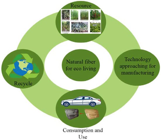 Natural fibers play an important role in improving the quality of human life. However, waste can be generated during the product life cycle and during the processing of natural fibers into bioproducts. To achieve the most efficient utilization of resources, waste management should be conducted continuously by recycling and/or upcycling of waste, aside from innovation in the design of bioproducts. Shanmugam et al. [] recognized recycling and the use of bio-based constituents as essential issues in adopting a circular economy (CE). CE adheres to the principles of reduce, reuse, recycle, and replace. CE is beneficial to the environment, economy, and society when used in FRC manufacturing. Given the numerous sustainability challenges confronting our societies, transitioning to a circular economy and closing resource loops through recycling is a viable solution []. Figure 7 proposes a CE concept based on natural fibers that is more considered than a linear economy concept for future resource conservation and environmental balance. The CE approach is gaining traction and has been proposed in some fields, such as carbon fiber manufacturing [], agricultural sector [] and biomass biorefinery [], for gradually reducing energy consumption during the manufacturing process. Biomaterials in the CE present numerous challenges for the industry in terms of developing new network and commercial opportunities while remaining focused on consumer demands [].