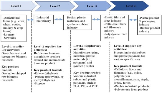 Simplified example of multi-level rubber and polymer markets for biomass (adapted from []).