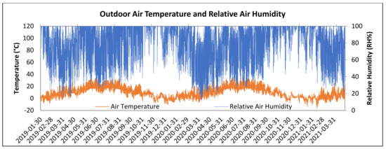 Outdoor air temperature and the relative air humidity values were recorded during the monitored period as shown in Figure 5.