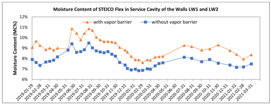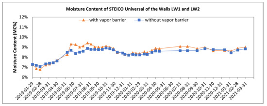 The Moisture Content of Fiberboard Insulation following Vapor Barrier.In the wall LW1 with the vapor barrier the insulation STEICO Universal reached slightly higher moisture content during the spring and the summer, it was especially due to reversed vapor transfer, i.e., outdoor humidity moves indoors entering the wall. The vapor barrier prevents the vapor transfer, and it was accumulated in the insulation situated in front of the barrier.