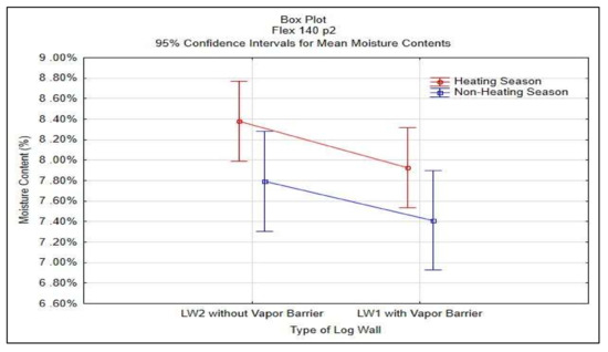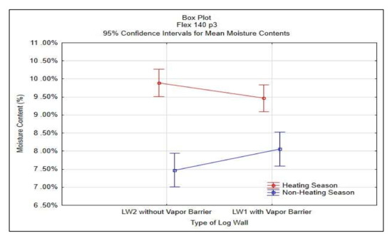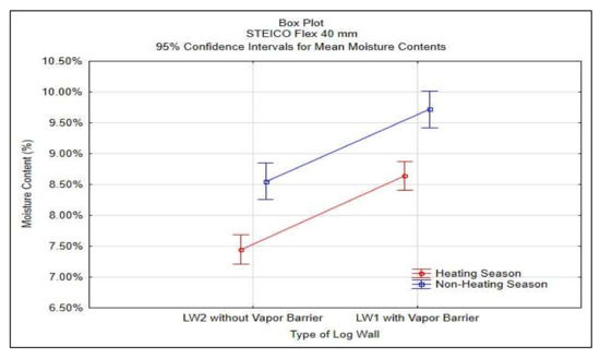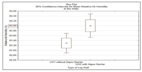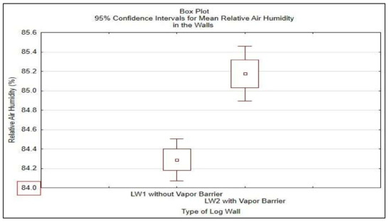 Undesirable excessive moisture is considered for the average moisture content of 20% lasting more than 2 weeks continuously. The verification of the undesirable excessive moisture increasing the risk of biodegradation is done at the border of the insulations STEICO Flex part 3 and the loadbearing log wall. The recorded values of the relative air humidity, shown in Figure 17, presuppose conditions favorable for the mold growth and wood decaying fungi at this border, particularly when relative air humidity reaches 70% or more. The statistics analysis results are shown in Table 8 and Figure 18. Average moisture content of the insulation STEICO Flex part 3 in the wall LW1 and LW2 reached during this period are compared below.