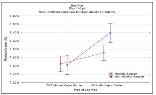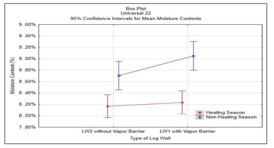 Secondly, verification of the undesirable excessive moisture due to the risk of biodegradation in fiberboard insulations in both fragments of the log walls. The second hypothesis: it is assumed that the critical average moisture content exceeding 20% causing the risk of biodegradation with mold and wood decaying fungi will not be reached in the fiberboard insulations of the log wall with and the wall without vapor barrier.