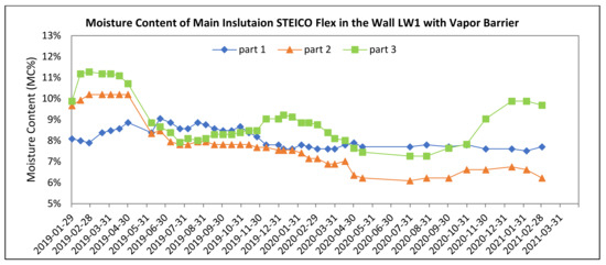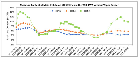 - In general, the significance in the insulation STEICO Flex part 3, shown in Figure 1 (3.3) and Figure 2 (3.3), cannot be determined; the moisture content of the insulation in the wall LW1 and LW2 oscillates depending on the weather conditions, probably caused by imperfect airtightness of the gaps in the loadbearing log wall.