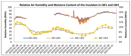 To confirm these results, relative air humidity in the walls was further investigated from 1 December 2020 to 30 April 2021. Borderline relative air humidity favorable for biodegradation was set to RH = 84% in accordance with the national standard in this period, and Student’s T-test was done. The results shown in Table 9 and Figure 19 confirm mean relative air humidity in the LW1 of 84.29% and in the LW2 of 85.18%. The insulation STEICO Flex part 3 in LW1 reached the average moisture content of 9.6% and the insulation in LW2 reached the average moisture content of 10.2%. The average moisture content of the insulation STEICO Flex part 3 in both walls LW1 and LW2 did not exceed 20%, and no risk of biodegradation appeared in the walls.