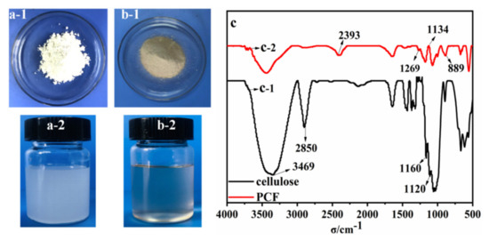 Comparison of the morphology and solubility in water of cellulose (a-1,a-2) and PCF (b-1,b-2); FITR of cellulose (c-1) and PCF (c-2).