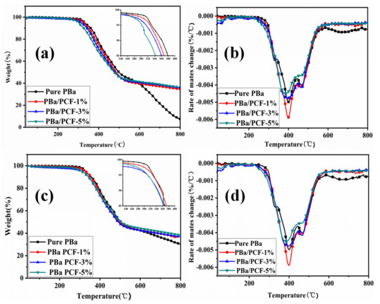 TGA (a) and DTG (b) curves of PBa and PBa/PCF composites in air and N2 atmospheres (c,d).