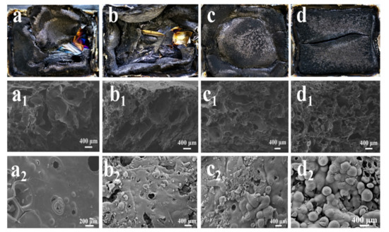 Digital photographs of the char layers (a–d) and SEM images of the residual char interior regions (a1–d1) and outside surfaces (a2–d2) of (a) pure PBa, (b) PBa/PCF-1%, (c) PBa/PCF-3% and (d) PBa/PCF-5%.