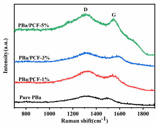 Raman spectroscopy was employed to investigate the structure of the char residues obtained from the CONE test. The char residues exhibited two characteristic bands, as presented in Figure 9. The D band at 1315 cm−1 and the G band at 1550 cm−1 contributed the vibration of amorphous carbon and the vibration of crystalline graphite carbon, respectively. In general, the integral area ratio (ID/IG) of the two bands was dependent on the graphitization degree of the carbonaceous materials. The lower ID/IG value demonstrated a higher graphitization degree. It can be inferred that the ID/IG values of the pure PBa and PBa/PCF nanocomposites were 1.023, 1.023, 1.018 and 1.016, respectively. Clearly, with the addition of PCF, the ID/IG values reduced. This phenomenon implies that the char layers of PBa/PCF composites were more compact compared with the original PBa. The results and the discussion of the Raman spectroscopy were in good agreement with those of the SEM.