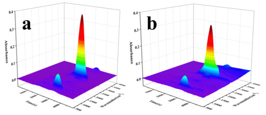 3D TG-FTIR images of pyrolysis products of (a) Pure PBa and (b) PBa/PCF-5%.