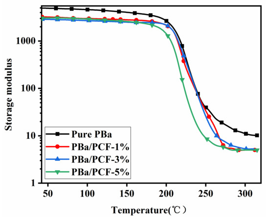 Storage modulus of PBa, PBa/PCF-1% and PBa/PCF-3% and PBa/PCF-5%.
