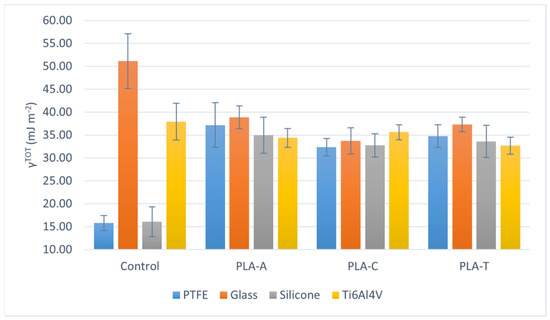Differences in contact angles translate into changes in the surface tension of the films. Table S2 in the Supporting Information lists all the surface tension components calculated according to the van Oss model [30,31,32]. Figure 1, Figure 2 and Figure 3 graphically represent the surface tension components in which the most relevant changes are found as a function of the solvent for each substrate. The total surface tension (γTOT, Figure 1) of the hydrophobic surfaces is 2 or even 3 times lower than that of glass or Ti6Al4V. However, the surface tension of PLA films casted on them reach very similar values, comprised between 30 and 40 mJ m−2. Since the total surface tension is the sum of the acid−base (γAB) and Lishitz−van der Waals (γLW) components, it is possible to discern whether the interactions are polar or non-polar, respectively.