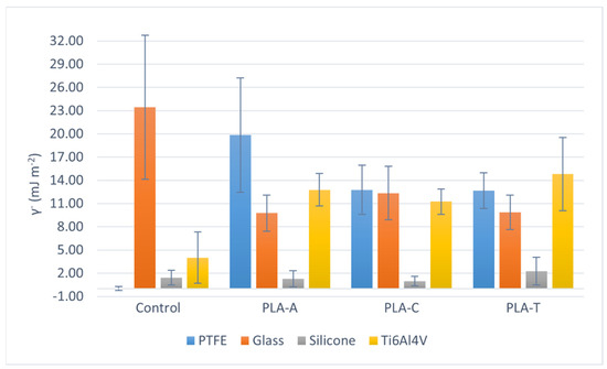 As it can be inferred from the table, data can be classified in two sets: one concerning silicone and another concerning glass, PTFE, and titanium alloy. Whatever the solvent used, PLA films prepared on silicone have a water contact angle about 30 degrees higher than those casted on another surface. This means that the behavior of PLA switches from hydrophilic to hydrophobic simply by depositing it on another material. This dramatic difference is maintained in the formamide contact angle, which also shows an increase of about 30 degrees. However, when the behavior of a non-polar liquid, such as diiodomethane, is evaluated, hardly any difference is found, so the interaction between the polymer and the substrate must be of the polar type and extends through the entire thickness of the film; hence, differences are found when measuring contact angles on the side exposed to the air. For films casted on silicone, glass, and Ti6Al4V, no differences are observed in the hydrophobicity of PLA depending on the solvent in which it is dissolved, which suggests that the influence of the substrate is much greater than that of the solvent, if any.