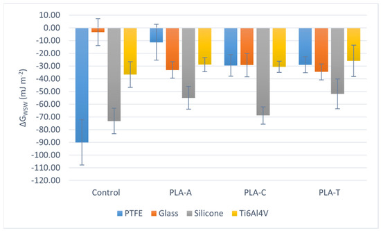 This behavior is supported by examining the interaction free energy of two surfaces immersed in water (ΔGSWS). The more negative this value is, the more the surfaces interact with each other and repel water. This is ultimately another measure of the hydrophobicity of the system. Thus, Figure 3 shows that the starting surfaces are very hydrophobic (PTFE and silicone), hydrophilic (glass), or moderately hydrophilic (Ti6Al4V). However, all PLA films show an ΔGSWS value around −30 mJ m−2, except for those casted on silicone, whose average values are between −50 and −70 mJ m−2.