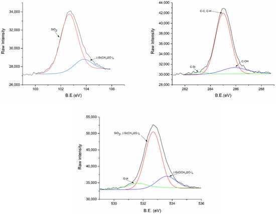 At this point, since the substrate that shows very different results compared to the rest is silicone, it is important to know its chemical nature in order to propose a mechanism of interaction between the polymer and the substrate. The surface chemistry of PTFE, glass, and Ti6Al4V is widely known [38,39,40], but not that of the silicone used in this work, so we analyzed it by XPS (Figure 5).
