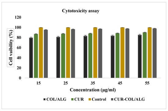 - Afzali, E.; Eslaminejad, T.; Rouholamini, S.E.Y.; Shahrokhi-Farjah, M.; Ansari, M. Cytotoxicity Effects of Curcumin Loaded on Chitosan Alginate Nanospheres on the KMBC-10 Spheroids Cell Line. Int. J. Nanomed. 2021, 16, 579. [Google Scholar] [CrossRef] [PubMed]