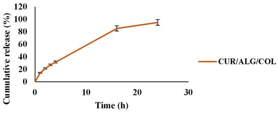 | 14 days | Curcumin/alginate–gelatin composite fibers | 98.75 ± 4.05 | [17] |