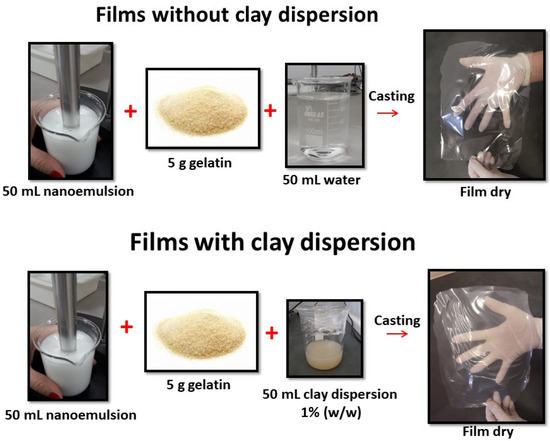 The gelatin filmogenic solution was prepared by the addition of 5% (w/v) of gelatin to distilled water, which was continuously mixed in a magnetic stirrer (500 rpm) at 60 °C until the gelatin was completely dissolved. The control sample with only gelatin was named GE. The other filmogenic dispersions were named GEP1, GEP2, GEP3, GEP4, GEDA, and GEP4DA, where P1, P2, P3, and P4, represent the nanoemulsions and DA the Cloisite Na+. In the films containing nanoemulsion, gelatin was added to the nanoemulsion. In the films with clay dispersion and nanoemulsion, DA was added to the nanoemulsion solution containing gelatin, previously solubilized. The nanoclay dispersion was added only in the films containing nanoemulsion with smaller particle size because, in this case, films with smaller particle size had better results in terms of mechanical properties and permeability.