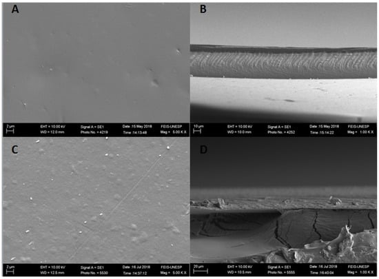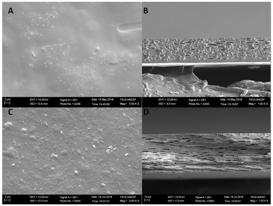 Scanning electron microscopy images of the films’ surfaces, (A)–GEP4 film, (C)–GEP4DA film; cryogenic fractures, (B)–GE P4 film, and (D)–GE P4DA film.
