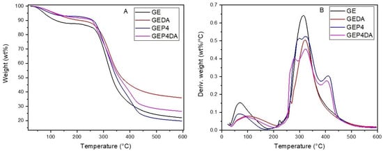 The third event only occurred for the films with nanoemulsions in their composition, GEP4 and GEP4DA. It can be concluded that this event probably indicates the degradation of the phenolic compounds present in the oils [8].