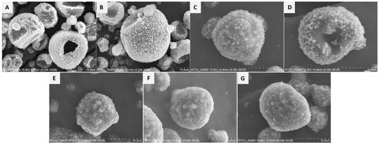 Scanning electron microscopy (SEM) micrographs of spray-dried chitosan/NaCl/maltodextrin microparticles with different formulations. (A) CNM; (B) MCC10; (C) MCC15; (D) MCC20; (E) WS10; (F) WS15; (G) WS20. The abbreviations and compositions of each formulation are described in Table 1.