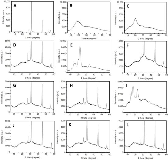 X-ray diffraction patterns of (A) NaCl; (B) maltodextrin; (C) chitosan; (D) CMN; (E) MCC alone; (F) MCC10; (G) MCC15; (H) MCC20; (I) WS alone; (J) WS10; (K) WS15; (L) WS 20. The abbreviations and compositions of each formulation are the same as in Table 1.