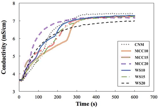 Conductivity–time curves of chitosan/NaCl/maltodextrin microparticles. The abbreviations and compositions of each formulation are the same as in Table 1.