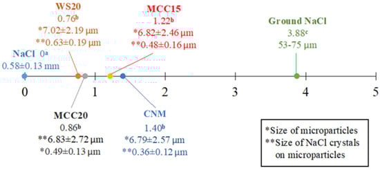 In the morphology study, we found that without the existence of crystalline carbohydrates, the microparticles would be ruptured and form hollow structures, which may absorb more moisture in certain extent as the result in Table 2. Adding chitosan in the spray-drying formulation resulted in rough particle surface [34], and are therefore capable of retaining NaCl crystals. Additionally, based on the results from X-ray diffraction (Figure 2), only minor peaks of typical chitosan crystalline reflections were found in the diffractograms of chitosan/NaCl/maltodextrin microparticles, indicating that the crystalline structures of chitosan no longer remained when forming the microparticles. In this condition, the chitosan molecules are assumed to be amorphous and are capable of providing more positively charged groups to help enhance the saltiness perception than the chitin nanomaterials we previously fabricated [23]. Through the SEM observation, we also found that the embedded NaCl crystals of the WS groups possessed a larger particle size than the others. This may be the consequence of gelatinization of waxy starch within the spray-drying process, which led to the internal moisture of microparticles diffusing to the outer layer. This further caused the merging of NaCl crystals into larger particles [30]. This may be one of the factors that lead to a lower saltiness perception of the WS groups than the CMC groups (Figure 4). On the other hand, the particle size of obtained microparticles in the present study are almost six times lower than that of previous reports, in which the spray dried particles were composed of maltodextrin and soy sauce [27].