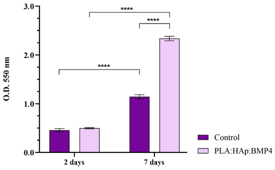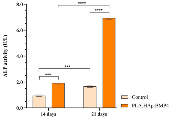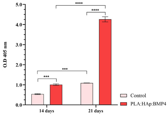 3.4. In Vitro Osteoinductive Potential of PLA/HAp/BMP4 Coatings
