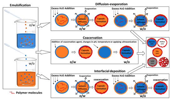 This technique involves a combination of diffusion-evaporation and coacervation after the formation of an emulsion. In a typical process, an organic solvent (with oil and/or partially water-miscible solvent), containing the dissolved APC and/or the dissolved polymer, is introduced drop-by-drop into an aqueous solution, under constant stirring. Subsequently, large volumes of water are added, such as in the emulsion–diffusion–evaporation method. This is done to draw out the partially miscible organic solvents from the emulsion droplets, thus driving the polymeric molecules inside the organic emulsion droplets to precipitate at the droplet interface under the suitable pH, temperature, or ionic conditions (similar to the chemical coacervation method) [51]. The particles are recovered and cleaned using centrifugation and filtration. Narrow size distribution is obtained. The technique does not require the usage of external high-energy sources. However, it is limited by drug solubility, given that hydrophilic drugs cannot be encapsulated using this technique. In addition, the removal of residual solvent is challenging. Other disadvantages include the requirement of extensive optimization of parameters, such as the salt type (and its concentration), intensive purification of the obtained particles, and possible incompatibility of the salts with the bioactive drugs. Aqueous core capsules have been prepared using this technique, wherein an aqueous phase containing acetone (lower boiling point than water) and the dissolved polymer is added to the oil phase to give w/o emulsion, followed by subsequent evaporation of acetone at reduced pressure and ambient temperature [94]. During the evaporation process, the dissolved polymer precipitates at the water–oil interface of the water droplet, due to the decrease in acetone concentration, and forms the polymeric capsules with an aqueous core. The rationale here is to utilize a polymer that is soluble in the water–acetone solution (but insoluble in pure water or oil). Hence, the choice of polymer is crucial. This may be why the aqueous-core capsules that are made of natural polymeric shell and prepared using this technique are hard to find.