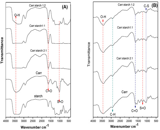 Infrared spectroscopy is an effective method commonly used for polysaccharide characterization to study molecular interactions distinguished by the change of absorption bands. The fingerprint region of typical spectra of κ-carrageenan is presented in Figure 2A. The broad band ranging between 3500 and 3100 cm−1 was attributed to O-H stretching vibrations, formed due to the vibrational stretching associated with free inter- and intra- molecular bonds in -OH groups [19], and the broad band around 2800–3000 cm−1 was attributed to C-H stretching vibration. Samples also show a band in the region of 750–1300 cm−1 that corresponds to the carbohydrates region [17,33]. The peak at 1220 cm−1 corresponds to the ester sulfate groups, and the peak at 1670 cm−1 is due to the carbonyl group contained in D-galactose [33]. Additionally, the FTIR spectra of starch typically show an extremely broad band at 3387 cm−1, and the band at 2930 cm−1 is attributed to the O–H stretching and the C–H stretching vibrations, respectively [34], as shown in Figure 2A. Meanwhile, the spectrum of carr/starch blend-based membranes shows stretching at 1200–1300 cm−1. Shifting of bands in this region is due to interactions between the charged functional groups of the C-O stretching band and the C-O-H group band from 1162 cm−1 (κ-carrageenan) to 1151 cm−1 (κ-carrageenan/starch 2:1) that can be related to the interaction (possibly through hydrogen bridges) of the OH groups of starch with the κ-carrageenan structure [35]. On the other hand, as shown in Figure 2B, after treatment of κ-carrageenan/starch membranes with an amylase enzyme, distinct peaks were visible at 3190–3380 cm−1 (s), due to N-H stretching of secondary amides, and 2980 cm−1, due to C-H stretching of the amylase enzyme, in addition to the characteristic peaks of κ-carrageenan/starch membrane that appeared [36].