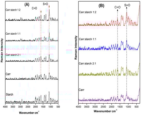 Raman scattering spectra of κ-carrageenan, starch, and Carr/starch blend-based membranes before (A) and after (B) treatment with amylase enzyme.