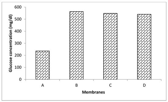 The investigation of the membranes’ biodegradability was dependent on the ability of the amylase enzyme to release glucose units from these membranes. As shown in Figure 4, higher concentrations of glucose were obtained from the three tested membranes (κ-carrageenan/starch 1:1, κ-carrageenan/starch 2:1, and κ-carrageenan/starch 1:2) in addition to lower glucose concentration from the plain κ-carrageenan membrane. The glucose concentration was almost 563, 548, and 540.5 mg/dL for the three mixed κ-carrageenan/starch membranes, respectively. However, the amylase enzyme showed an ability to degrade the κ-carrageenan polymer, and released 236 mg/dL glucose. In most cases, using pure enzymes for the biodegradation of waste is preferred over using whole living microbes due to their greater catalytic activity and the absence of seasonal fluctuations [41]. However, the use of soil microbes for the biodegradation of potato peel starch depending on hydrogel was investigated through soil burying of the prepared materials [42].