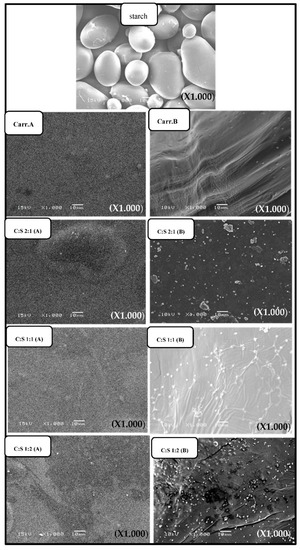 SEM micrograph of surface of starch, Carr, and Carr/starch blend-based membranes before (A) and after (B) enzymatic treatment at magnification power of 1000×.