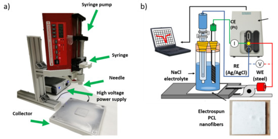 Finally, the electrochemical measurements of Tafel polarization curves were carried out on an Autolab Potentiostat/Galvanostat PGSTAT302N (Metrohm, Herisau, Switzerland). All corrosion tests were performed at room temperature in 3.5 wt% NaCl aqueous solutions, using a conventional three-electrode cell consisting of a working electrode (steel AISI 304), a silver chloride Ag-AgCl reference electrode and a platinum counter electrode. Before conducting all the experiments, the samples were immersed in 3.5 wt% NaCl electrolyte for 30 min to make sure that the system is in steady state and with the open circuit potential (OCP) stabilized. A schematic representation of the electrospinning setup as well as the electrochemical cell for the corrosion tests performed on the electrospun PCL samples is summarized in Figure 1.