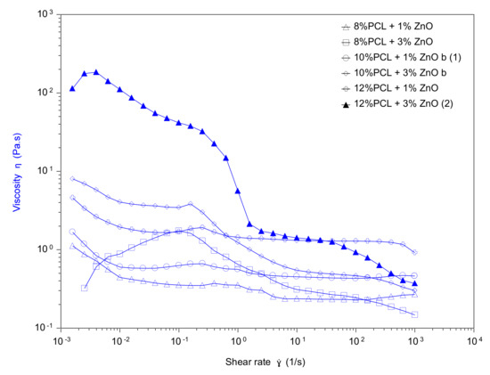 Viscosity of the PCL solutions with different contents of ZnO as a function of shear rate.