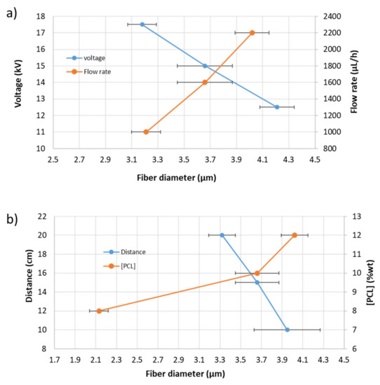 (a) Evolution of the fiber diameter as a function of the applied voltage and flow rate; (b) evolution of the fiber diameter as a function of distance and PCL solution concentration, respectively.