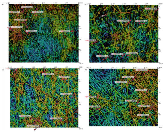 The surface morphology and the thickness of the whole electrospun samples has been evaluated by using a confocal microscope (model S-mart, SENSOFAR METROLOGY, Barcelona, Spain). The confocal microscope applies a course shift single algorithm with an objective of EPI 50X v35 for an area of 340.03 × 283.73 µm. According to the standard ISO 25178, the roughness surface (S-L) measurements have been obtained with three different filters: a low filter (F-operator-level), a high filter (S-filter, standard cut off λs: 2.5 µm) and a Gaussian filter (L-filter, standard cut off λc: 0.08 mm, Sa < 0.02 µm). These topography measurements were used for estimating the average fiber diameter (Df) and roughness surface (Sa) of the samples.