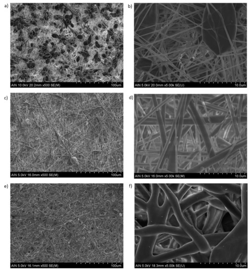 In order to have a better appreciation of the surface morphology, Figure 6 shows SEM images of the samples at different PCL concentrations (8 and 12 wt%, respectively). First of all, as mentioned, the presence of multiple beads within the fibers can be appreciated for the sample composed of 8 wt% PCL (Figure 6a), showing the aspect of bead-on-string structures with oval shapes as can be observed in the magnified SEM image (Figure 6b). A higher polymer molecular weight (12 wt%) can generally stabilize the resultant fibrous mat structure, although different fiber morphology can be clearly appreciated as a function of the solvent evaporation. According to this, the formation of straight electrospun fibers with a round cross section (indicative of an elongational flow) are obtained when the resultant solvent has totally evaporated before reaching the collector (see Figure 6c,d). However, the formation of flat fibrous structures with wet fibers is observed when the solvent has not completely evaporated (see Figure 6e,f). These wet fibers can flatten upon impact onto the collector, showing a coalescence and as a result, the fiber diameter has increased [58]. Another aspect to mention is that by using electrospinning technique it is possible to modulate the formation of porous electrospun PCL fibers as a function of the selected solvent system [59,60,61]. After observing SEM images, the ratio used for the binary system (DCM:DMF) is adequate for the formation of smooth fibers for the PCL concentration range, showing only differences in the presence of beads or in the resultant fiber diameter, respectively.