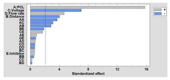 Once the influence of the factors on the fiber diameter has been experimentally shown, the results obtained in the DOE is presented. In Figure 7, the Pareto diagram is shown, where the influence of the main parameters on the fiber diameter (PCL concentration, distance, voltage and presence of the inhibitor) is observed. Likewise, the Pareto diagram also shows the effect of the interactions between the main effects on the fiber diameter. This diagram indicates that PCL concentration is the most significant factor, observing how as the concentration increases, so does the fiber diameter. The same occurs with flow rate, while voltage and distance have an inversely proportional influence. However, the presence or absence of the inhibitor does not show a significant effect on the fiber diameter, as mentioned. Finally, the estimated surface response of the significant factors in the average fiber diameter is presented in Supplementary Materials (see Figure S1).