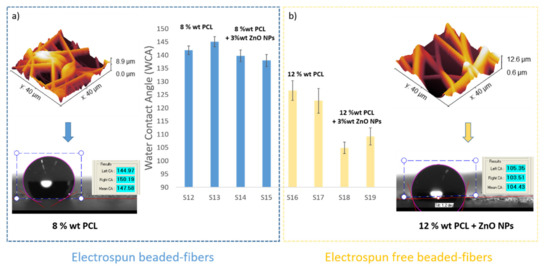 The second one is that the contact angle values for beaded fibers samples (8 wt% PCL) are higher than bead-free fibers samples (12 wt% PCL) [73], the contact angle values being higher for the samples with lower than average fiber diameter. Another important conclusion is that the thinner beaded fibers showed a higher surface roughness and, therefore, the samples showed higher water contact angle values than the thicker bead-free fibers, respectively [74,75]. This effect associated to the design of a multilevel fiber-bead structure has been reported [76] with the aim of obtaining a higher surface roughness, demonstrating that a good control over the operational parameters such a low applied voltage and a high flow rate produces an increase of the resultant surface roughness.